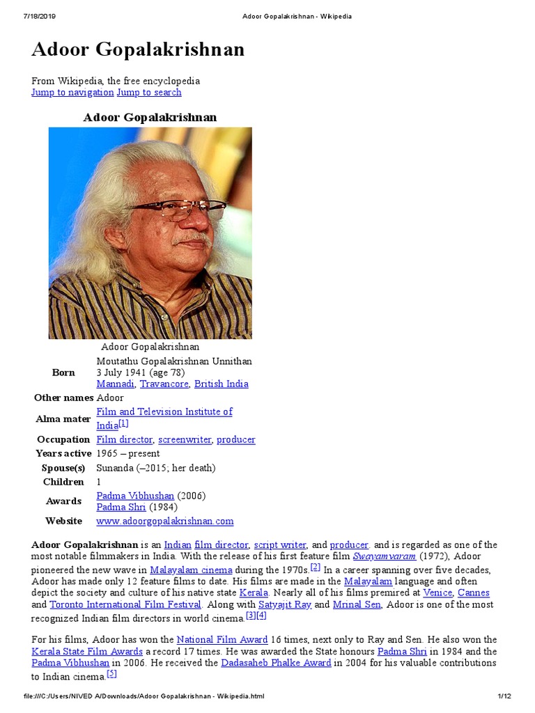 Adoor Gopalakrishnan Profile / E é considerado um dos cineastas mais notáveis da índia.